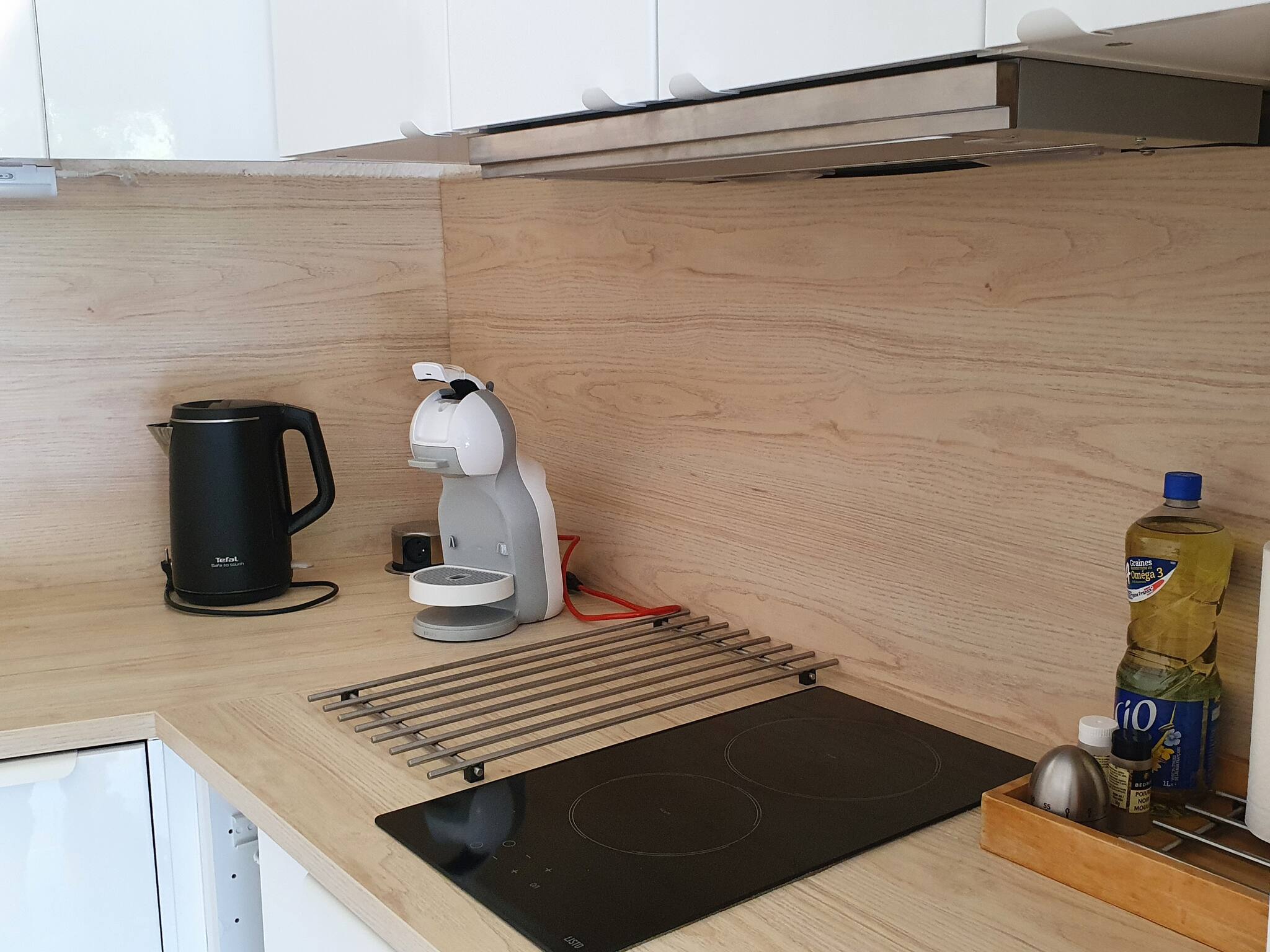 The open kitchen area overlooking the living room is equipped to prepare your meals 🍽️: Nespresso coffee machine, induction hobs, microwave, refrigerator and washing machine. It allows you to stay connected with your loved ones while cooking, and enjoy the shared space.