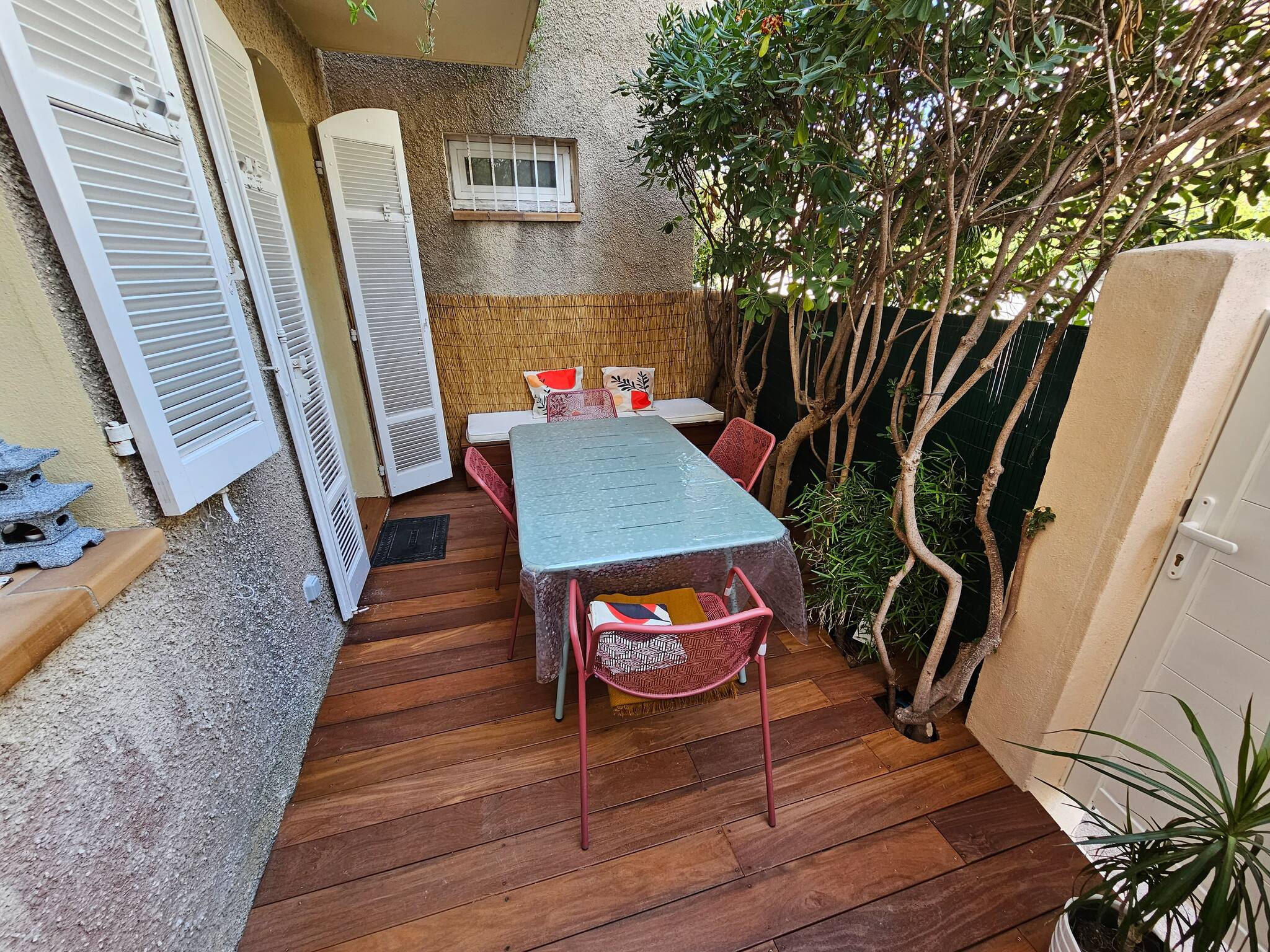 Terrasse vue mer avec portillon pour accès direct à la plage.