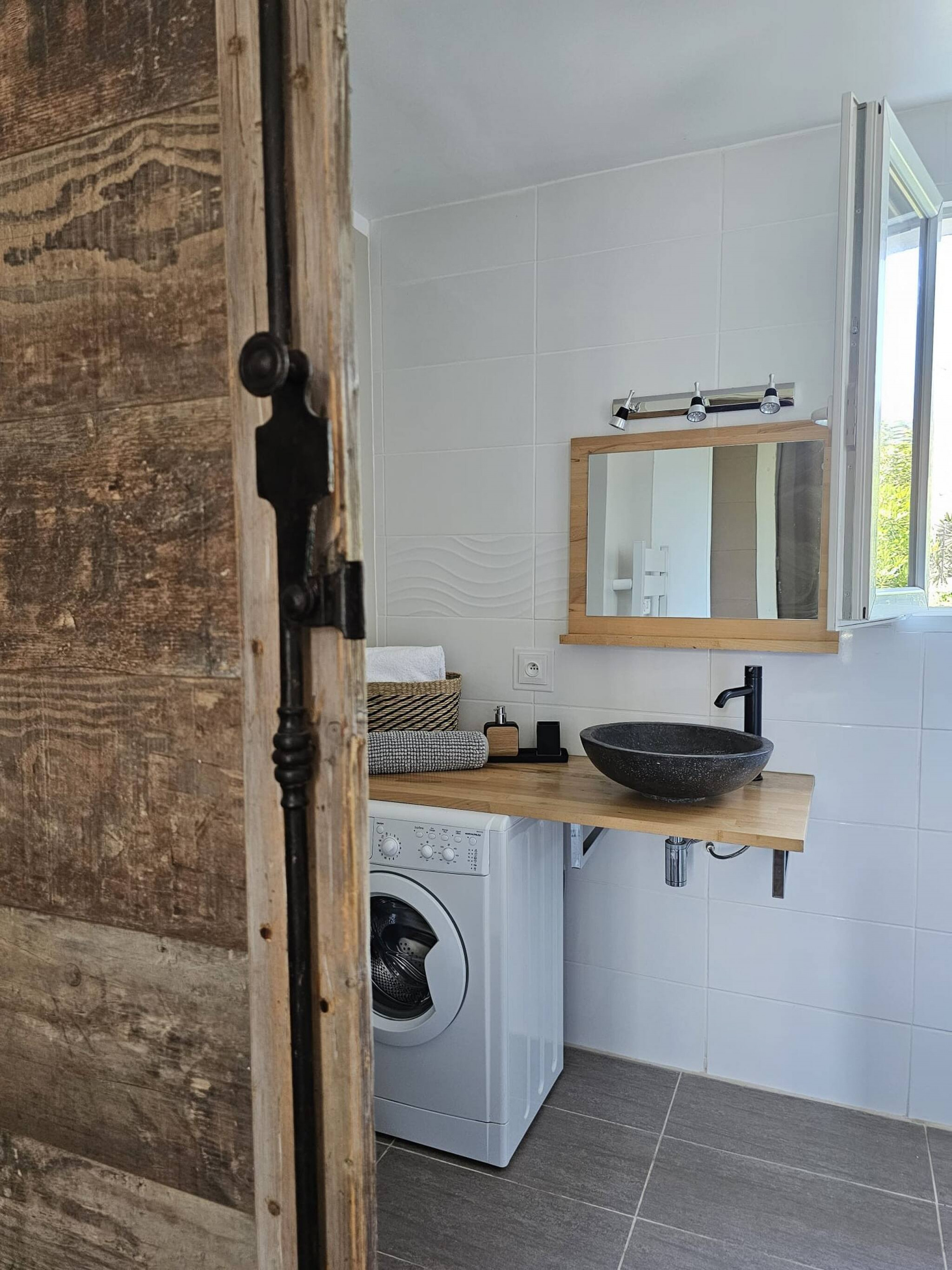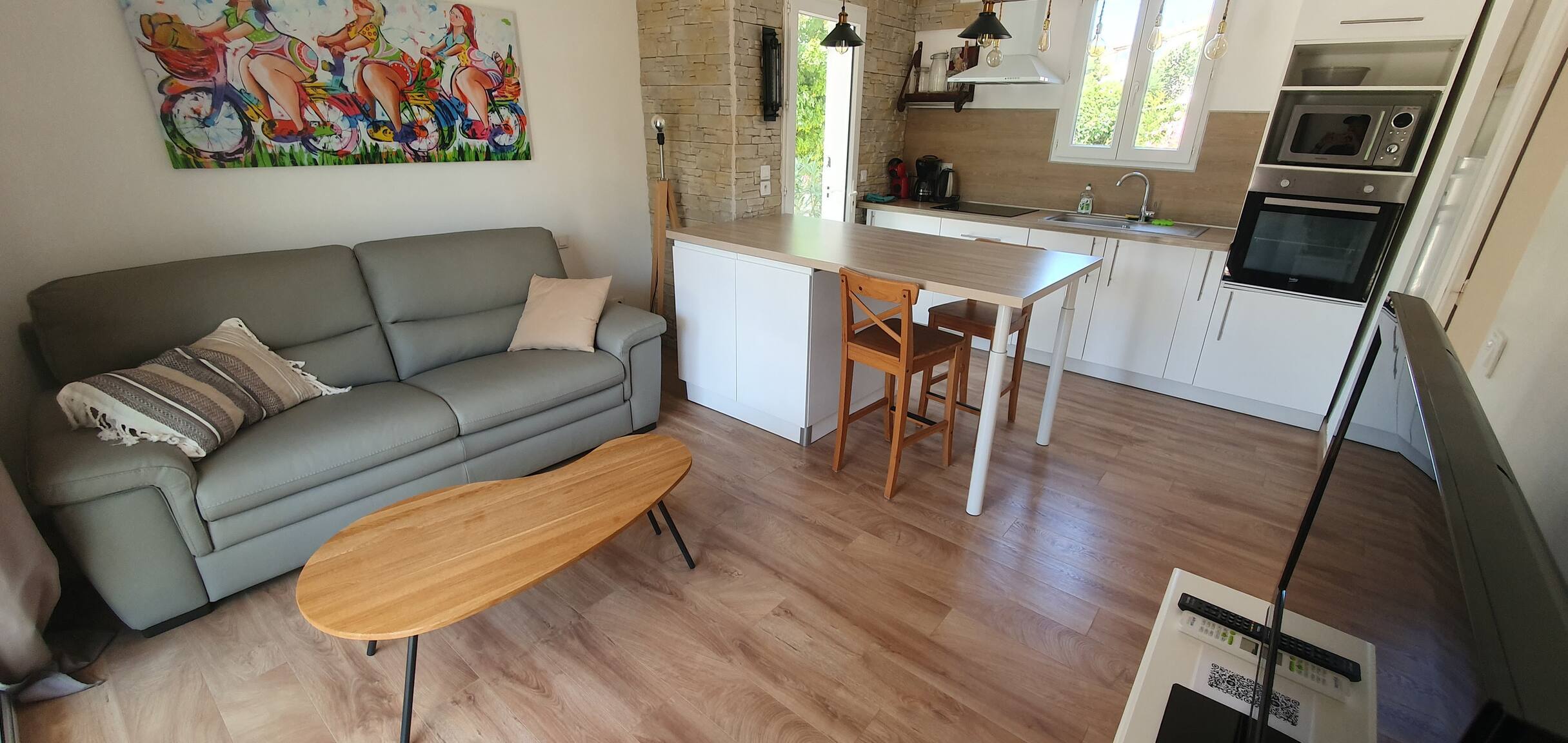 Il est composé d'une petite chambre avec salle d'eau attenante, de WC séparé, d'une cuisine équipée ouverte sur le salon (télévision, connexion internet WI-FI), d'une agréable terrasse ensoleillée.