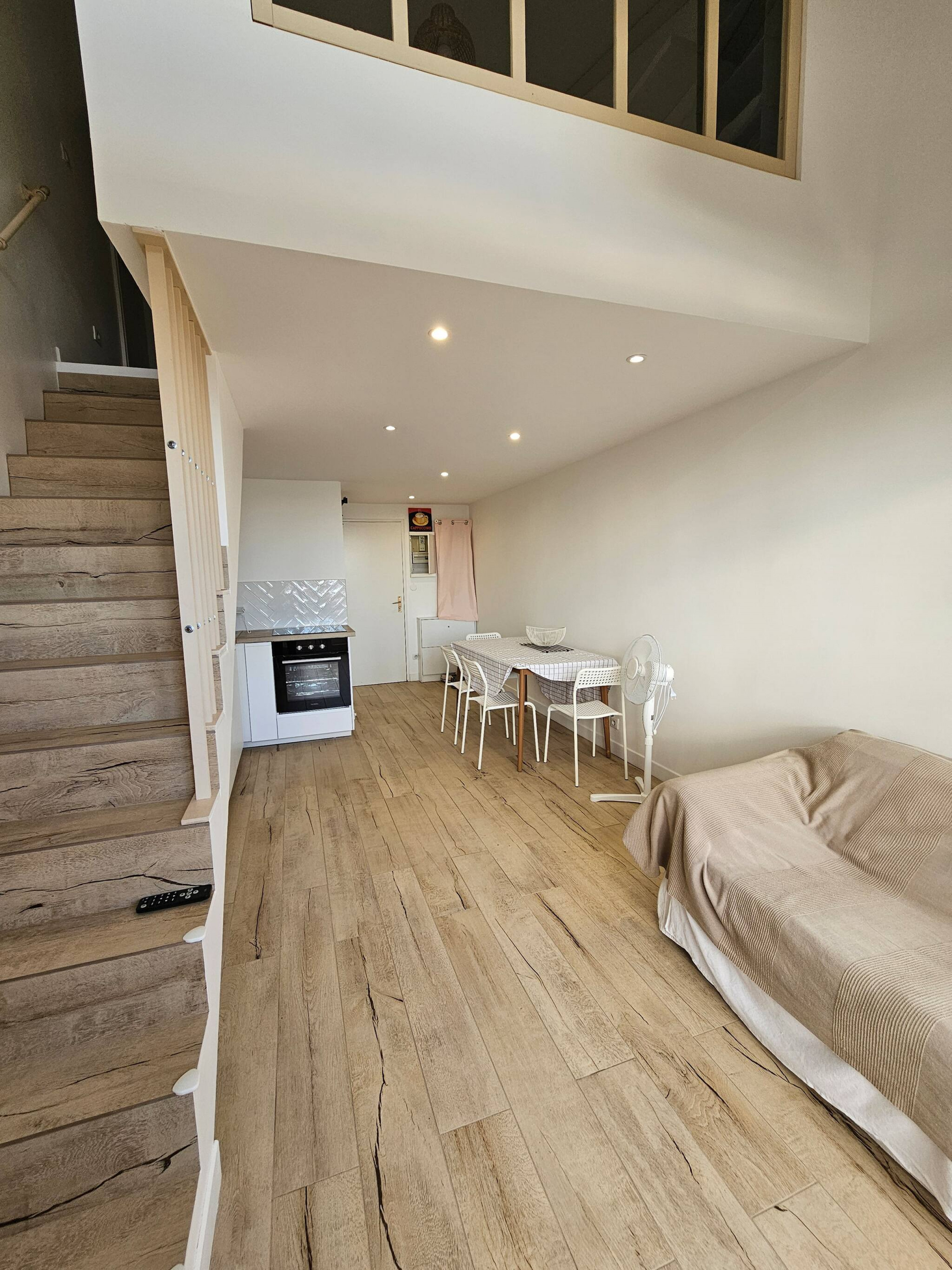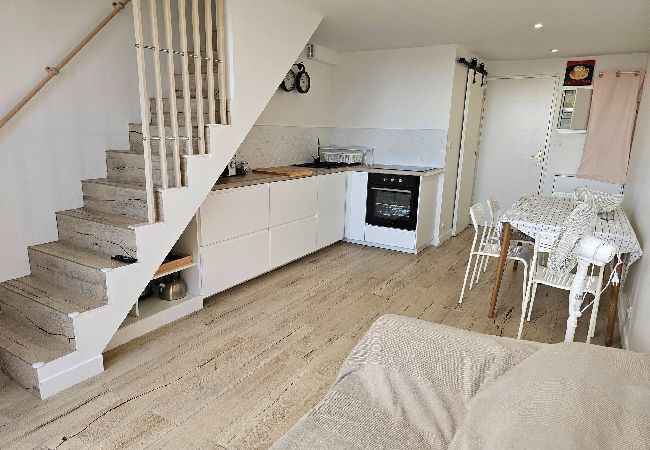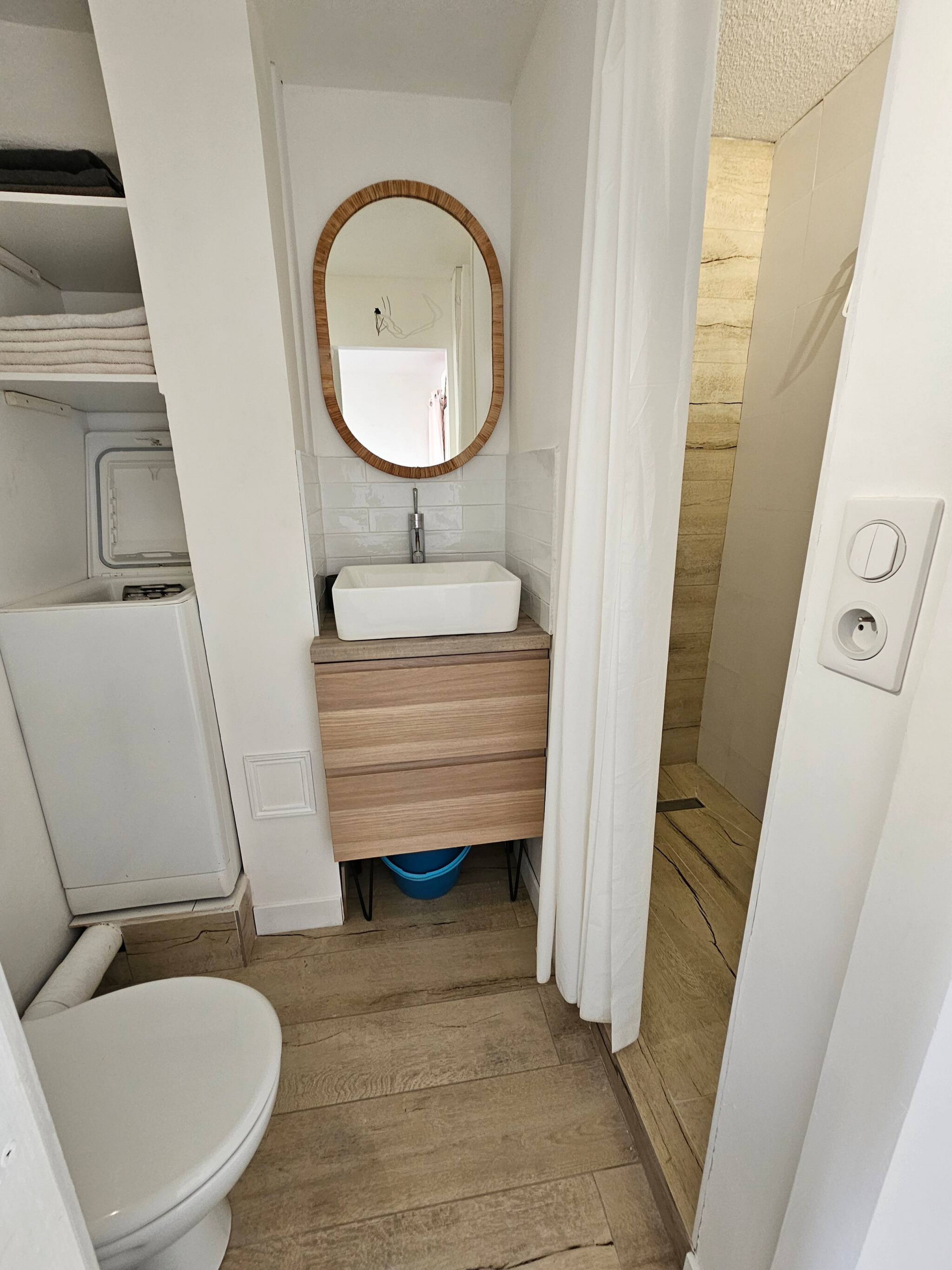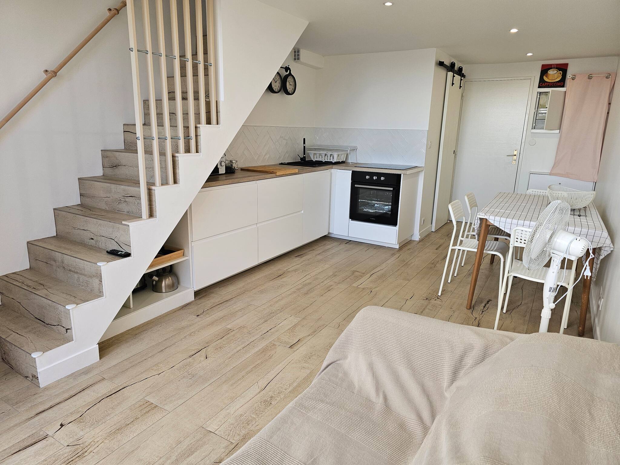 Le studio se compose d'une pièce de vie avec un canapé clic-clac pour le couchage, un couloir avec 2 lits superposés "cabine" idéal pour des enfants, une salle d'eau et 1 wc séparé.