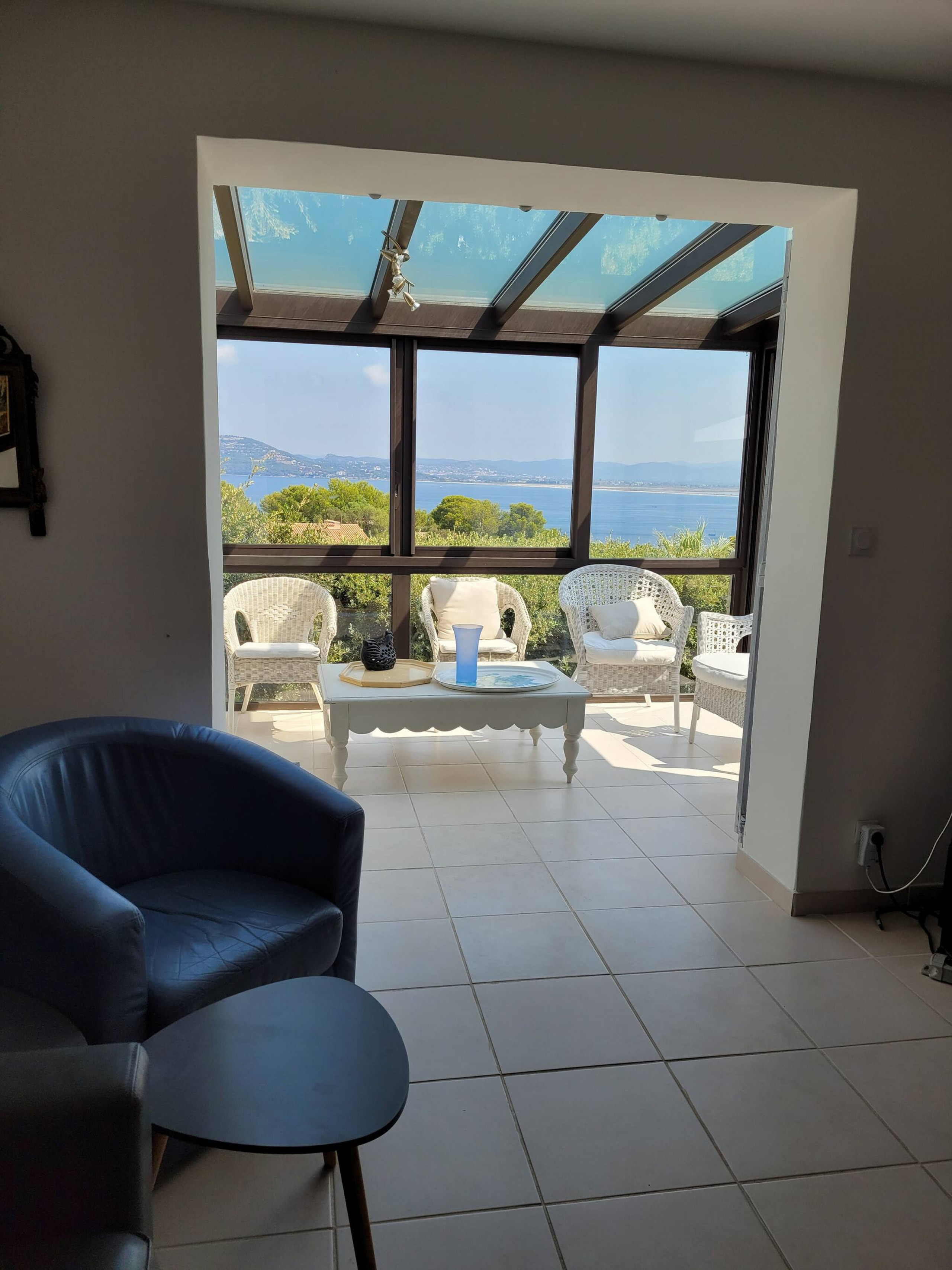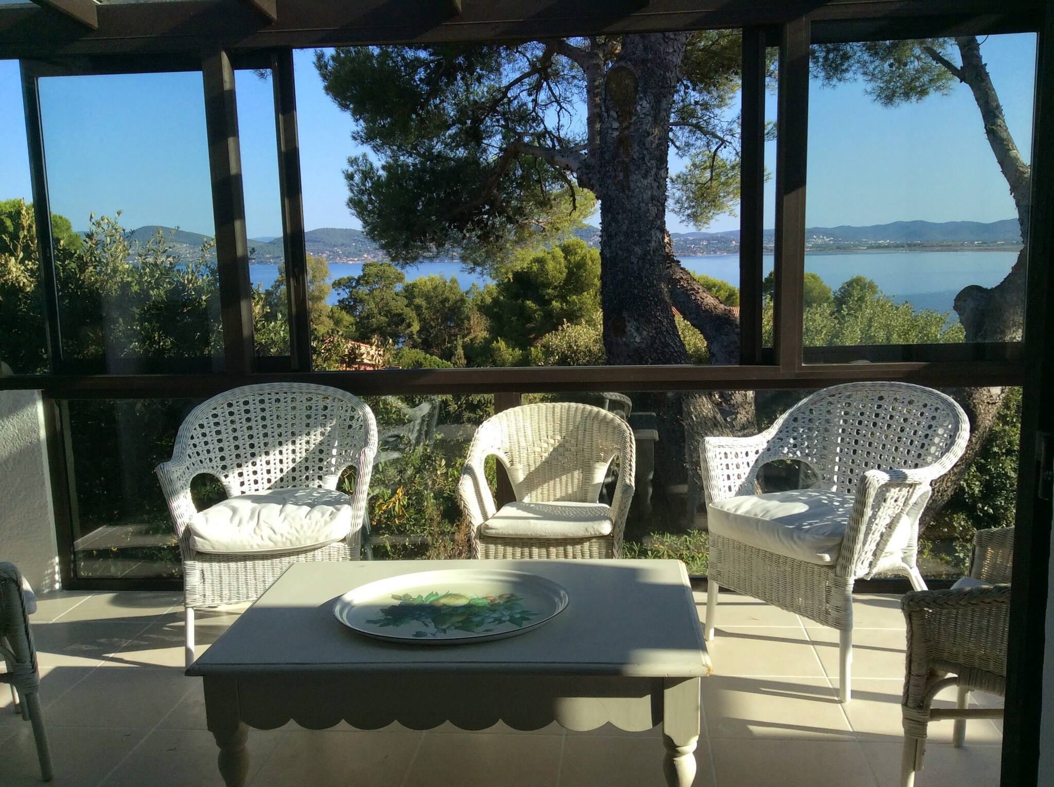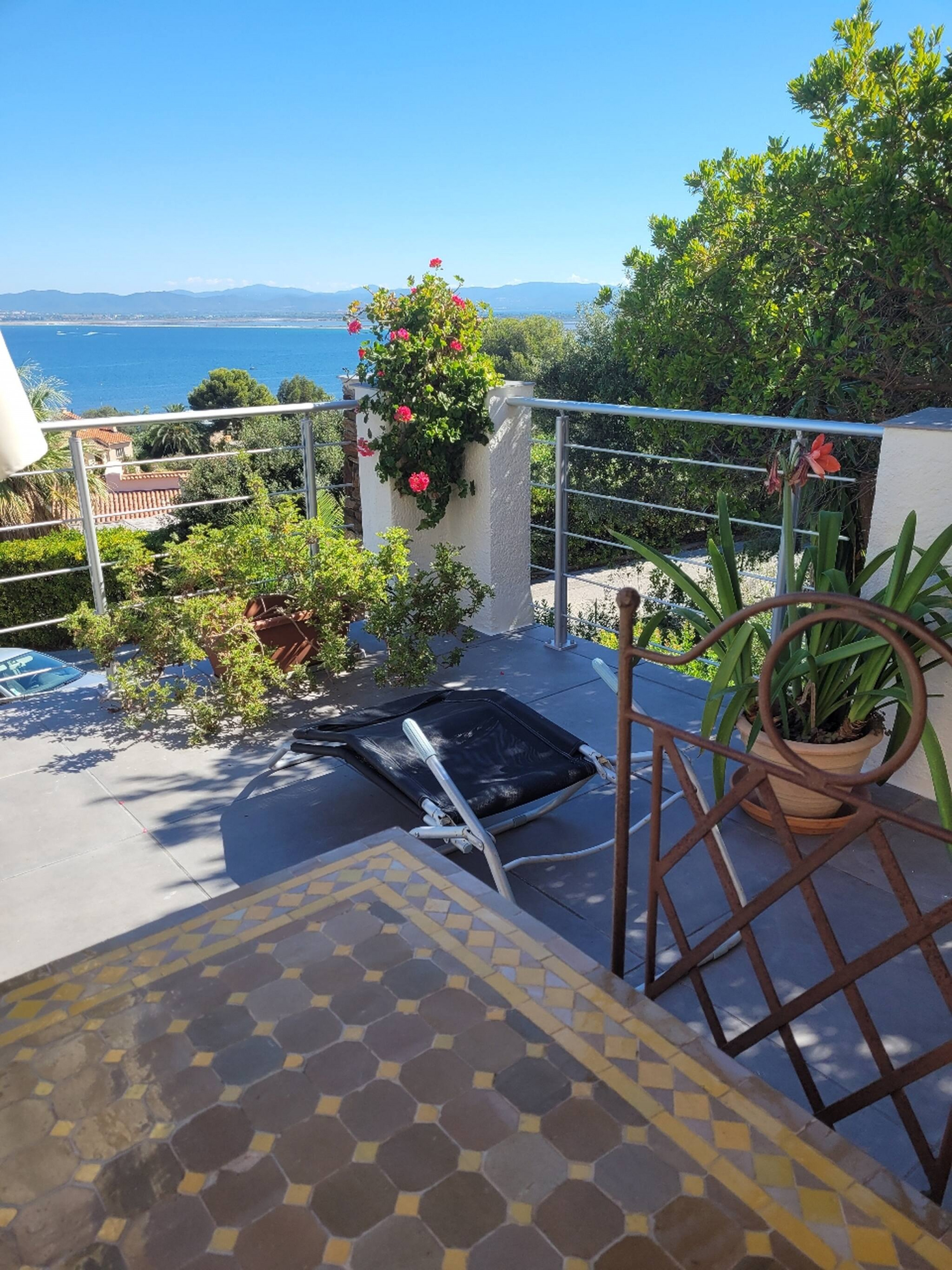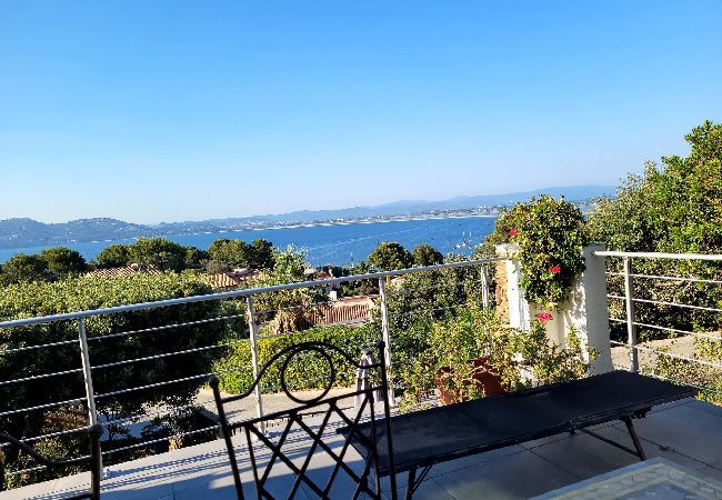 Villa climatisée dans résidence privée au calme avec vue imprenable sur la presqu'île et le golfe de Giens depuis la grande terrasse et le solarium.