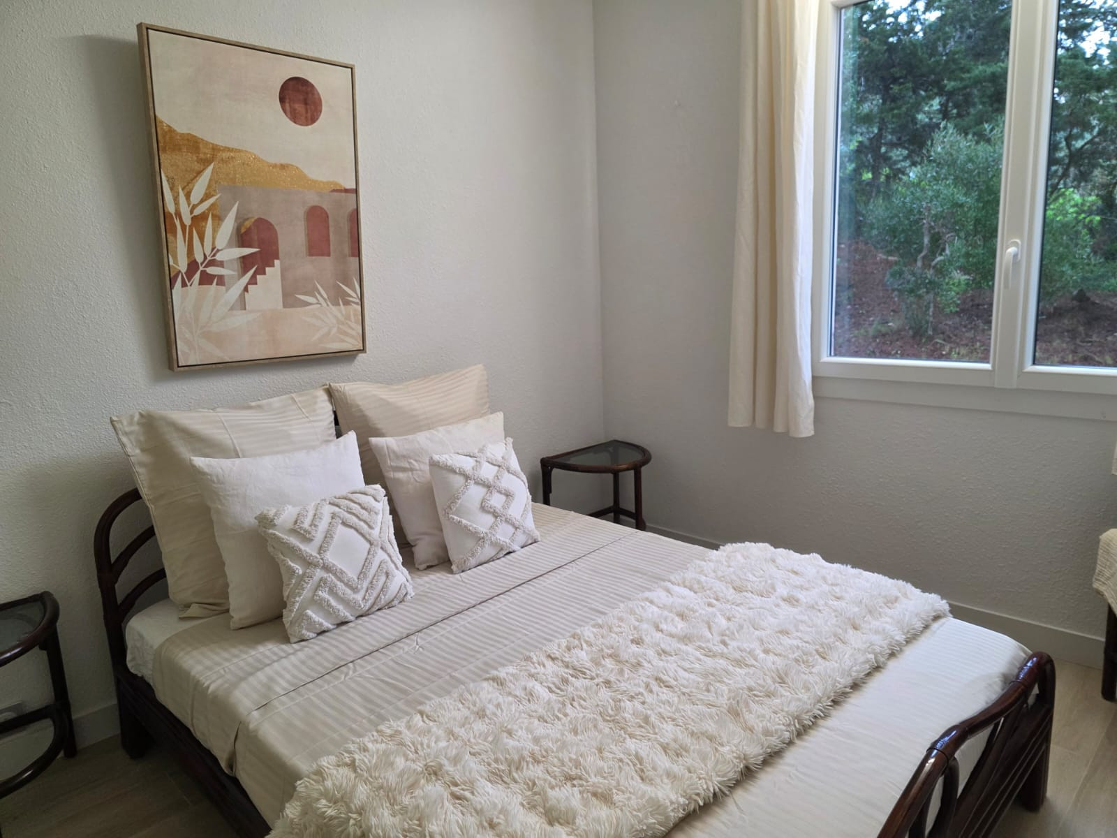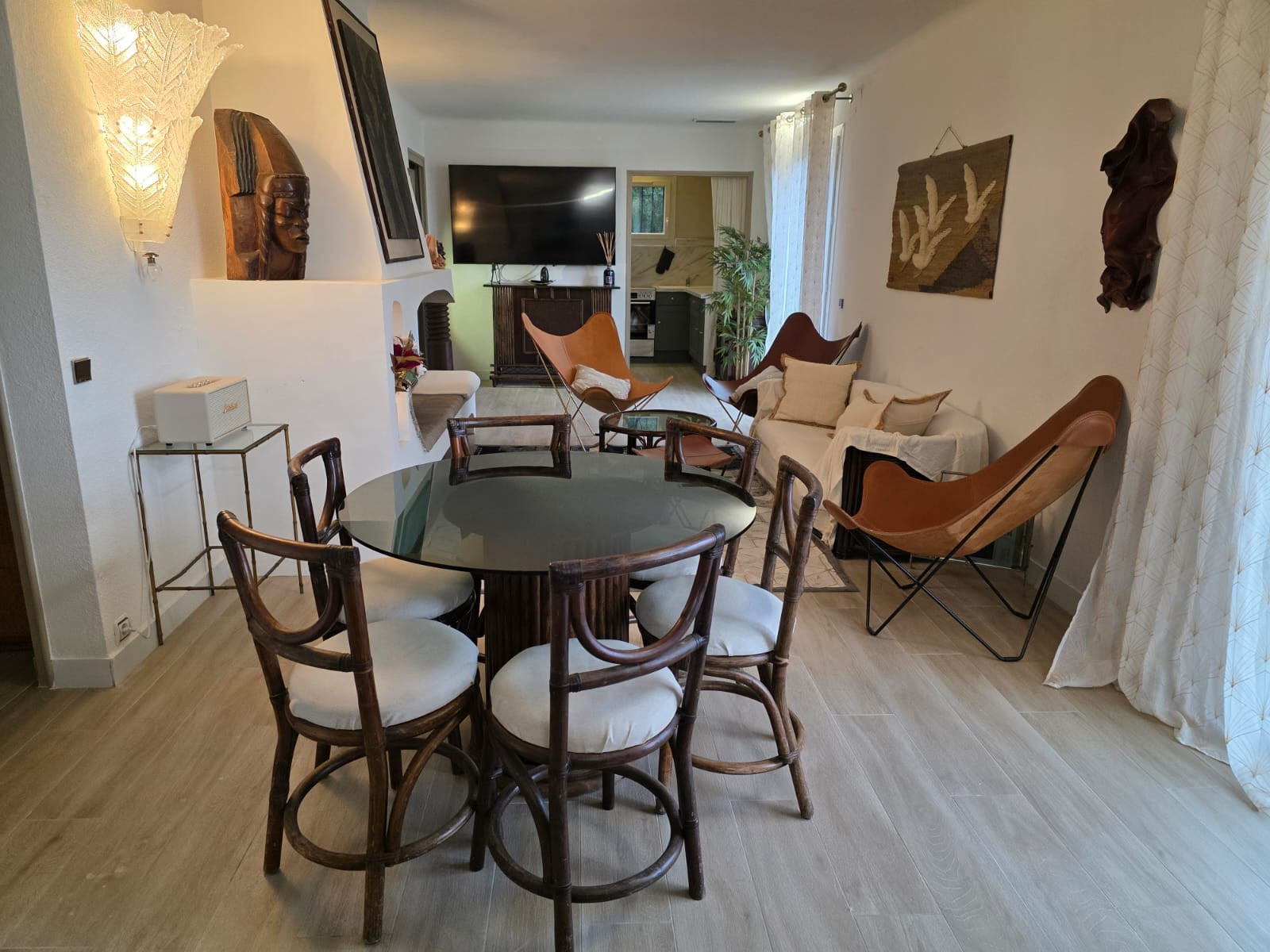 3 chambres climatisées, 2 doubles et une grande "dortoir", grand salon et salle à manger climatisés, cuisine semi-ouverte, 2 wc, 2 salles de bain et un espace extérieur avec plancha, petit réfrigérateur et évier, un grand jardin et un terrain de boules